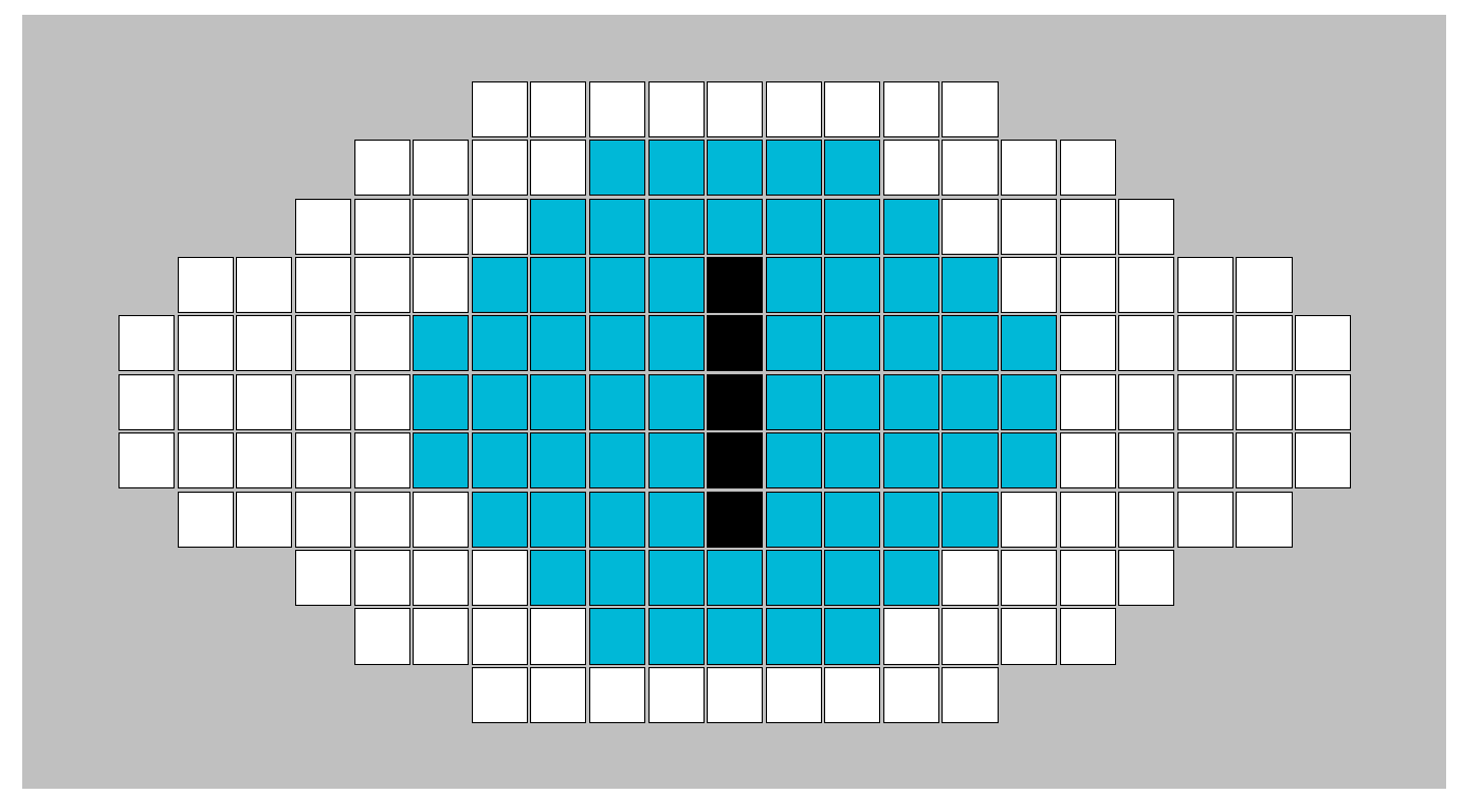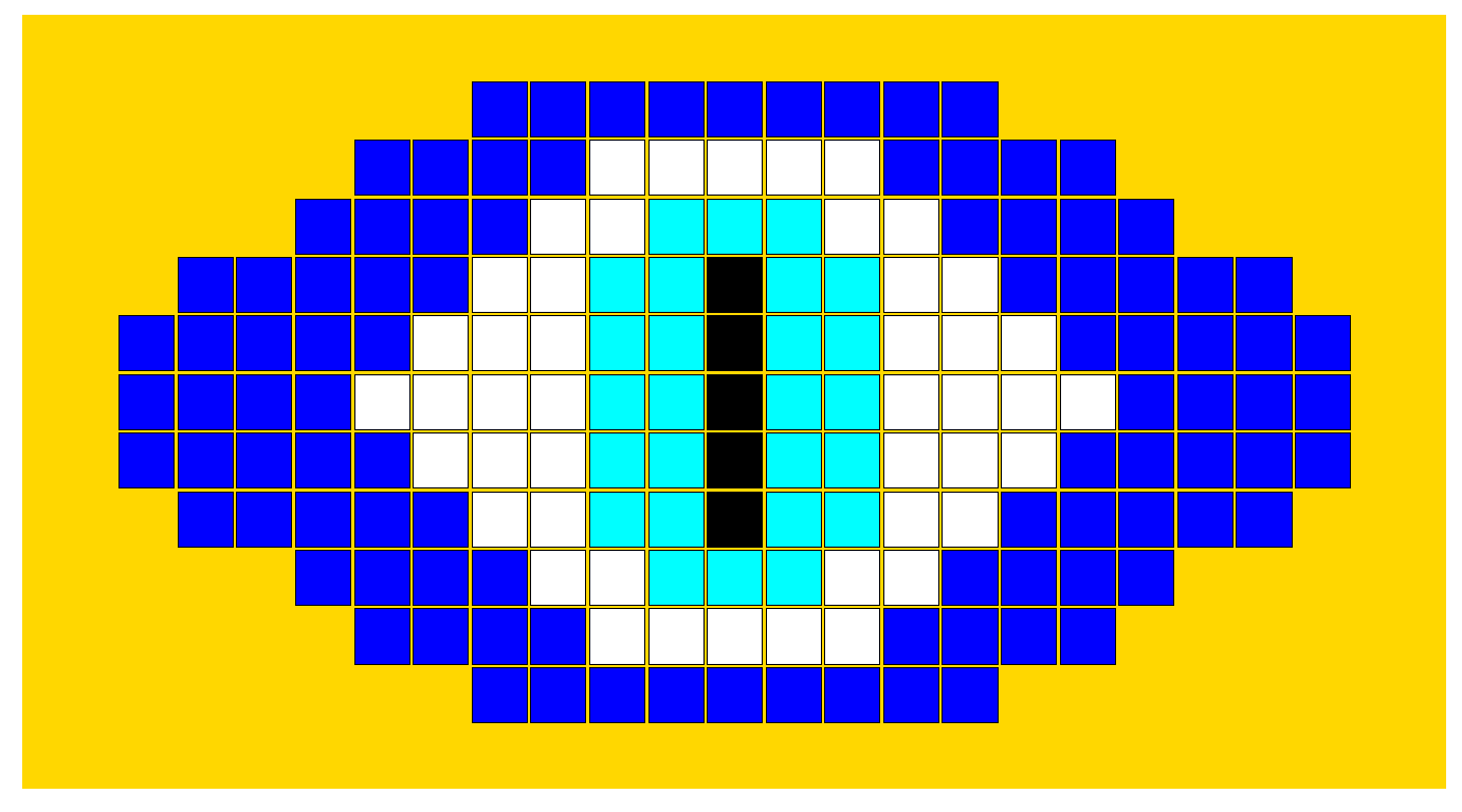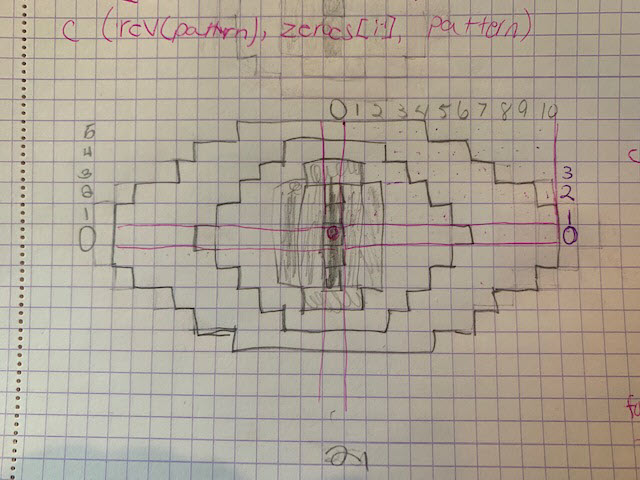 I like how this type of evil eye symbol is symmetrical with respect to both the x and y axes. I figured I could use that to my advantage when I create the data frame to plot an evil eye. I could essentially figure out one quarter of the pattern and replicate it forward and backwards, and up and down. Here is my evil eye sketch on graph paper. Notice the center point, center column and center row: